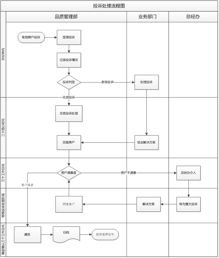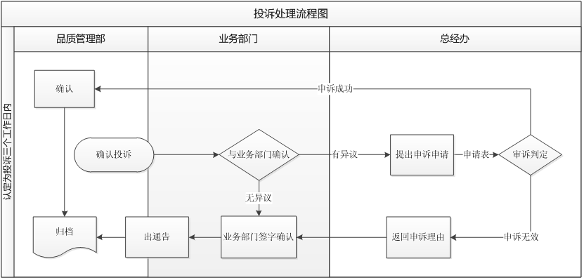 7、總經辦在接到投訴申訴申請時原則上是3個工作日給予申請部門反饋結果,如3個工作日未給出反饋結果對總經辦責任人進行扣分,如有特殊情況提前與業務部門溝通,另行處理;
