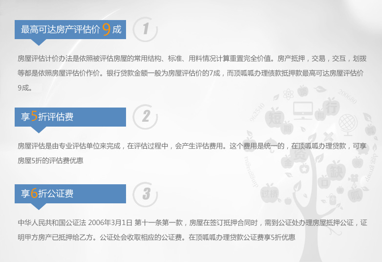 高檔公寓等10<貸款金額<500 執行銀行利率 先息后本,等額等息 不超過10年 20年內 頂呱呱全款房抵押貸款優點